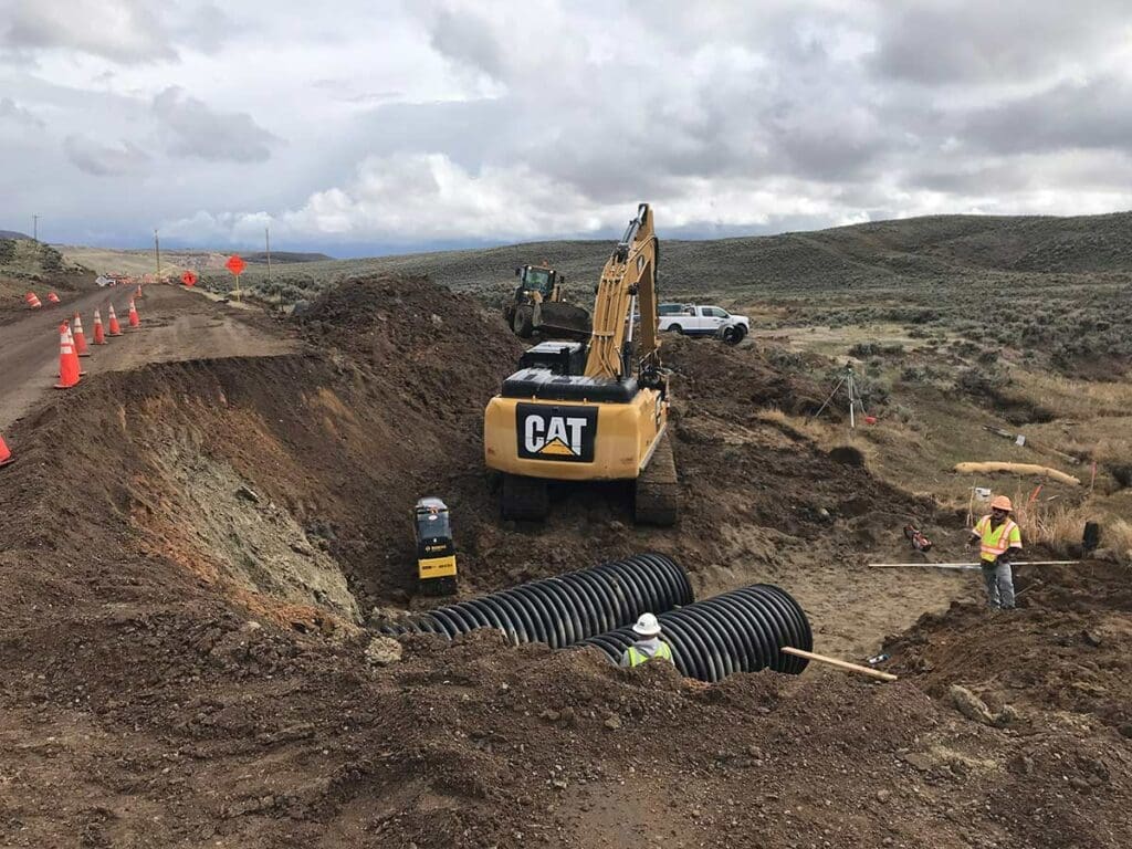 In total the team moved over 210,000 cubic yards of material to reshape the five miles of roadway. To date, over half of that volume has already been moved. Two of the project’s three large structures have already been placed, including reinforced concrete box culverts. The last large structure, slated to begin in the coming weeks, is the wildlife crossing. Fortunately, the area has had a dry summer which has greatly aided the pipe crew’s installation of the drainage pipes, which range from 18” all the way to 60”. Finally, road base installation started in July as part of the plan to pave this project in one year.